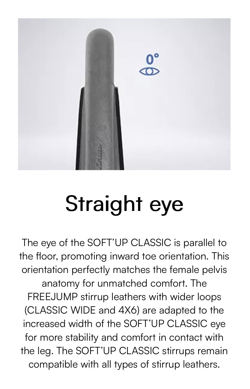 The SOFT’UP CLASSIC stirrup is designed with a straight eye that promotes inward toe orientation. This orientation perfectly adapts to the female pelvis anatomy, allowing for a straight leg position.